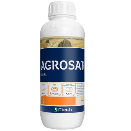 Acționează prin absorbția în frunze, muguri verzi și coajă nelemnoasă, transportându-se până la rădăcini și stoloni, provocând uscarea buruienilor.Primele efecte, precum îngălbenirea și ofilirea, apar în 7-10 zile, iar eliminarea completă a buruienilor are loc în 2-3 săptămâni.Temperaturile ridicate, umiditatea și expunerea la soare sporesc eficiența produsului.Continutul substantelor active: Glifosat 360 g/l Mod de Actiune: Agrosar 360 SL, un erbicid concentrat aplicat foliar, este special conceput pentru combaterea pirului si a altor buruieni monocotiledonate si dicotiledonate, atat anuale, cat si perene.Se aplica in diverse contexte, inclusiv inainte de pregatirea terenului pentru semanat, aratura de dupa recolta, cultivarea merilor, in gradini, miristi, pe parcele cultivate, si in jurul casei.Produsul este ideal pentru stropitoare de camp autopropulsate sau tractoare, precum si pentru echipamentele din livezi dotate cu instalatii de erbicidat sau stropitoare manuale.Mod de utilizare: Buruieni Sensibile (Exemple): Doza de 3 l/ha: Iarba buruienilor unilaterale, Naiul obisnuit, Quinoa alba, Macul de camp, Maruna inodora, Erbivor canadian, Libelul, Amidon batran, Traista ciobanului, Iarba anuala de lunci.Doza de 4 l/ha: Miristi, Violeta de camp, Quinoa alba, Mac de camp, Maruna inodora, Iarba de canapea, Agatata, Troscot, Teaca ciobaneasca.Doza de 5 l/ha (inclusiv): Patlagina, Mugur, Floarea de colt, Mustar de camp, Gaina comuna, Musetel comun, Amarant aspru, Macris galben, Macica de pasari, Maces cu frunze inguste.Buruieni cu Sensibilitate Medie (Exemple): Doza de 3 l/ha: Muscata mica, Violet stralucitor.Doza de 5 l/ha: Lapte de camp, Urzica comuna, Viteaza, Troscot, Macris de camp, Salcie glandulara.Doza de 7,5 l/ha: Soarba, Ciulinul, Urzica, Turba persana.Contraindicatii: Agrosar 360 SL nu trebuie utilizat: Inainte de aparitia buruienilor.Pentru plantele bolnave si deteriorate.In perioadele de seceta excesiva sau ploi iminente.Cand temperatura noptii scade sub 5°C.In timpul vantului....