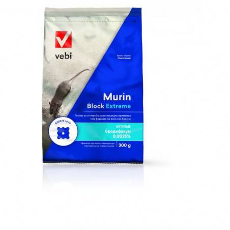 raticid murin block extreme, momeală rodenticidă, sub formă de cuburi parafinate, gata de utilizat, pentru șoareci și șobolani Substanța activă: Brodifacoum 0,0025 g Benzoat de denatoniu 0,001 g Specii vizate: Șoarecele de casă (Mus musculus) Șobolanul gri (Rattus norvegicus) Șobolanul negru (Rattus rattus) Domeniu și aria de utilizare:Poate fi utilizat atât în interiorul clădirilor, cât și în jurul acestora, în diverse tipuri de locații, inclusiv: Clădiri industriale (depozite de marfă, stive de marfă pe nave) Locuințe și zone rezidențiale Cantine, garaje, cămări Grădini și arii externe Guri de evacuare și canalizare Doze de aplicare recomandate: 20-40 g de Murin Block Extreme per stație de intoxicare.